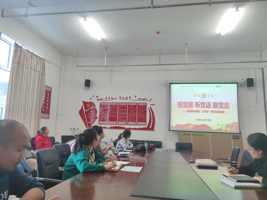 为全面学习宣传贯彻党的二十大精神,全力推动“感党恩、听党话、跟党走”群众教育实践活动走深走实要求,12月13日下午,beat365官网唯一教师党支部在崇文楼B123会议室开展“五句话”的事实和道理主题宣讲活动,学院中国近现代史纲要课程教研室主任张舒作专题报告,学院全体教师参加学习。