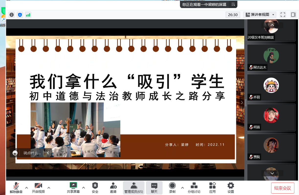 为了更好适应教育部师范类专业认证的新要求,进一步加强专业建设,11月5日,beat365官网唯一组织开展“中学政治教师素质养成”系列讲座的第二讲,邀请到鄂尔多斯市东胜区第一中学梁婷老师为学院学生作“初中道德与法治教师成长之路分享”线上主题讲座。讲座由学院吴娇老师主持,学院全体学生在线参加。