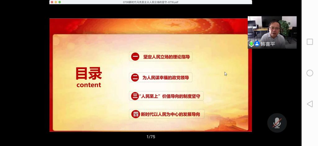 7月16日下午,beat365官网唯一“毛泽东思想和中国特色社会主义理论体系概论”课程组全体教师与内蒙古思政课教师通过腾讯会议共同聆听了吉林大学马克思主义理论一级学科带头人韩喜平教授做的题为《新时代马克思主义人民立场的坚守》的主题讲座。韩教授以马克思主义的基本立场为切入点,从坚定人民立场的理论指导、为人民谋幸福的政党领导、“人民至上”价值导向的制度坚守、新时代以人民为中心的发展导向四个方面深入分析了中国共产党人民至上的根本立场、制度保障以及在新时代的坚守等问题,诠释了中国共产党发展壮大的终极密码。