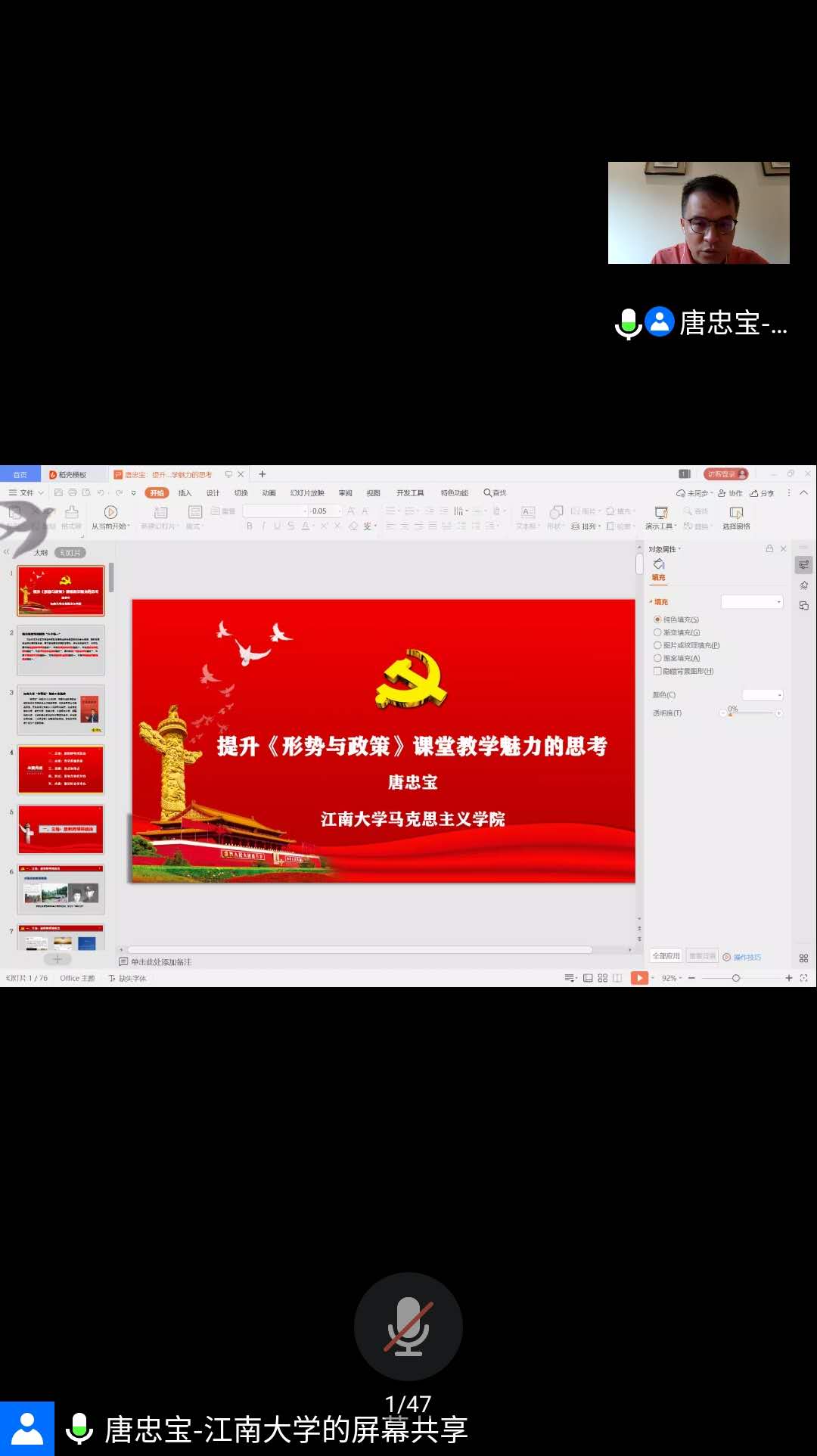 7月7日下午两点半,beat365官网唯一“形势与政策”课程组教师通过腾讯会议参加了由内蒙古师范大学主办的内蒙古思政课教师同备一门课——形势与政策课线上集体备课活动。本次活动聘请了江南大学beat365官网唯一教授、哲学博士,教育部首批思政工作精品项目“宝哥说”思政文化育人品牌主讲人唐忠宝教授作了题为“提升《形势与政策》课堂教学魅力的思考”的精彩讲座。