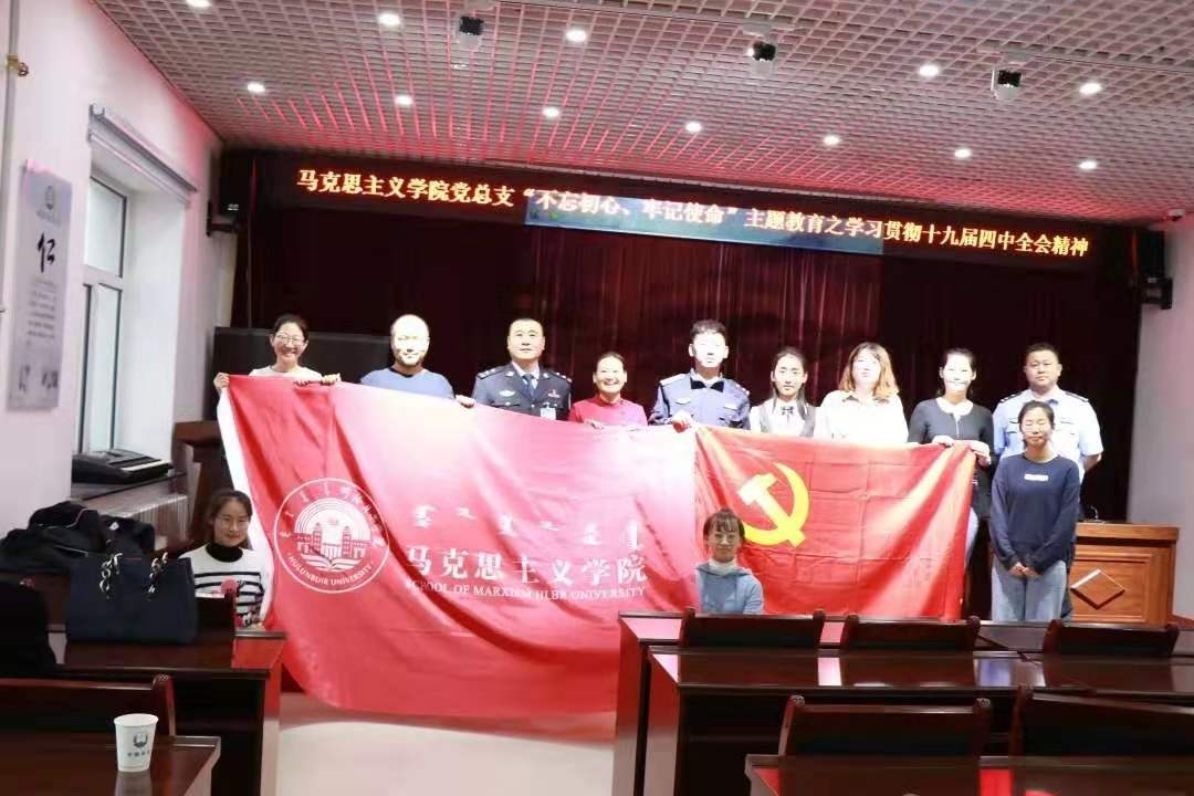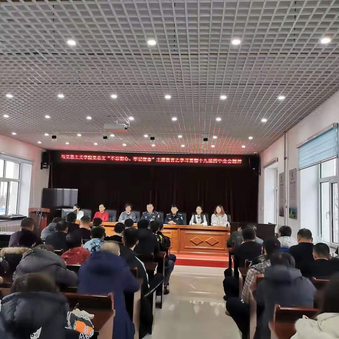 2019年11月22日下午,beat365官网唯一党总支书记刘凤琴、副书记刘琳、教师李琳颖、张舒、吴娇、李昱以及优秀学生代表赴鄂温克自治旗巴彦托海司法所进行“学习贯彻十九届四中全会精神”理论宣讲。司法所组织辖区保释人员、矫正人员等40余人以及司法所全体工作人员参加宣讲活动。主讲教师李琳颖。